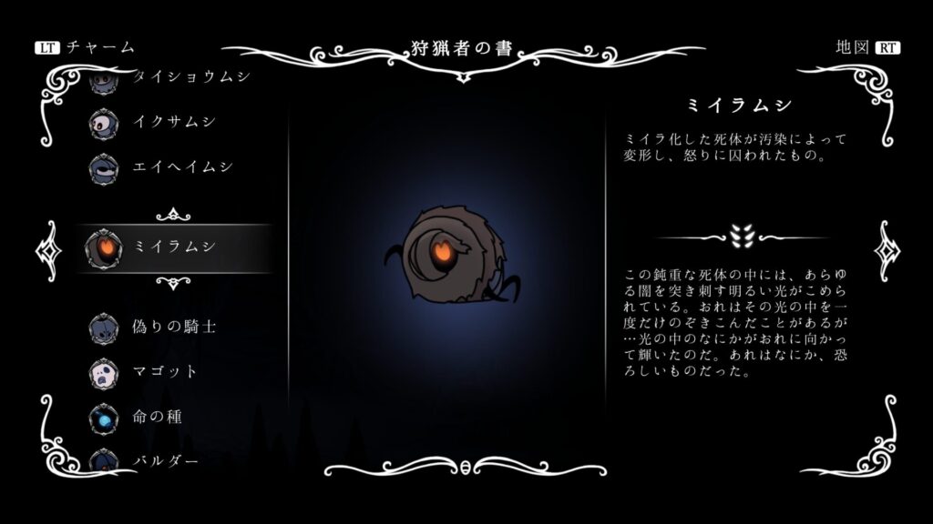 安息の地というエリアの性質上、過去の記憶や魂に関連する存在なのかもしれませんが、狩猟者の書に登録されるのが忘れられた交叉路あたりのムシと同じあたりというのが気になります。
